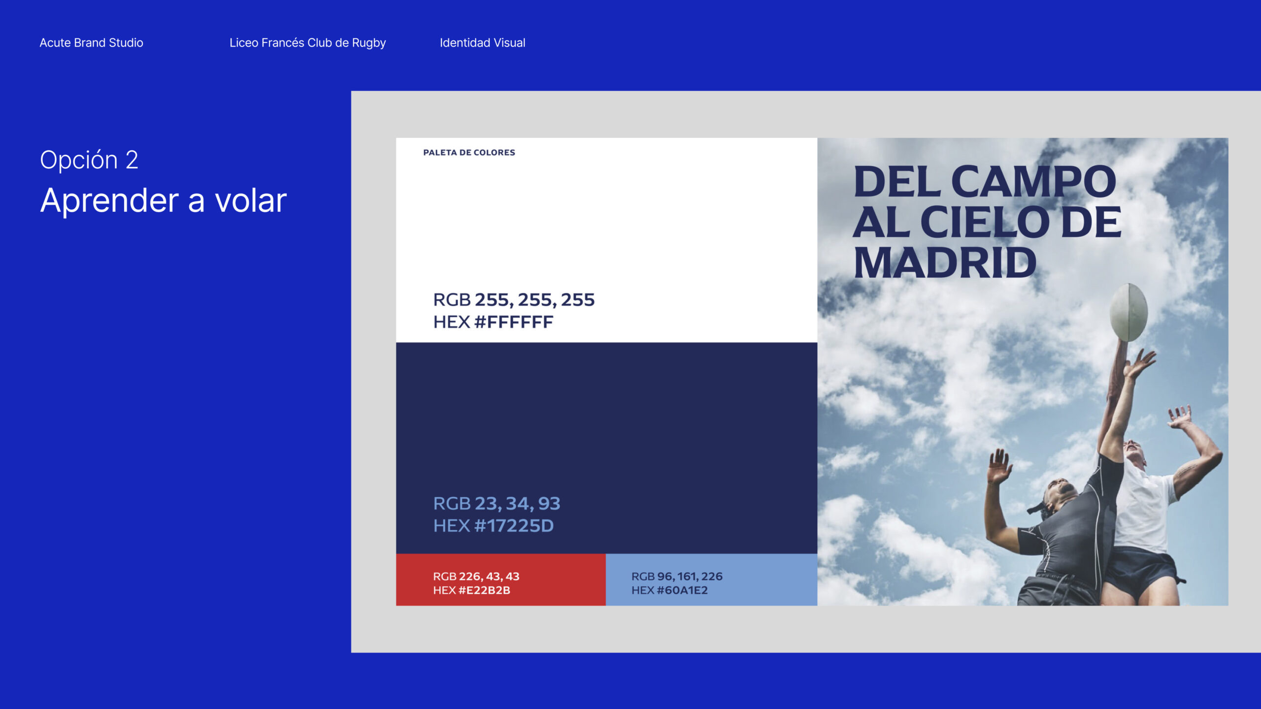 El Club de Rugby Liceo Francés de Madrid acudió a nosotros para rediseñar su marca e impulsar una nueva etapa en su historia. Fundado en 1968 por la comunidad educativa del Liceo Francés, el club es uno de los referentes históricos del rugby formativo en España. El encargo suponía un reto en múltiples dimensiones: actualizar su identidad visual y verbal sin perder su esencia educativa, poner en valor su carácter franco-español y proyectar una imagen más cohesionada y profesional ante su comunidad y patrocinadores.