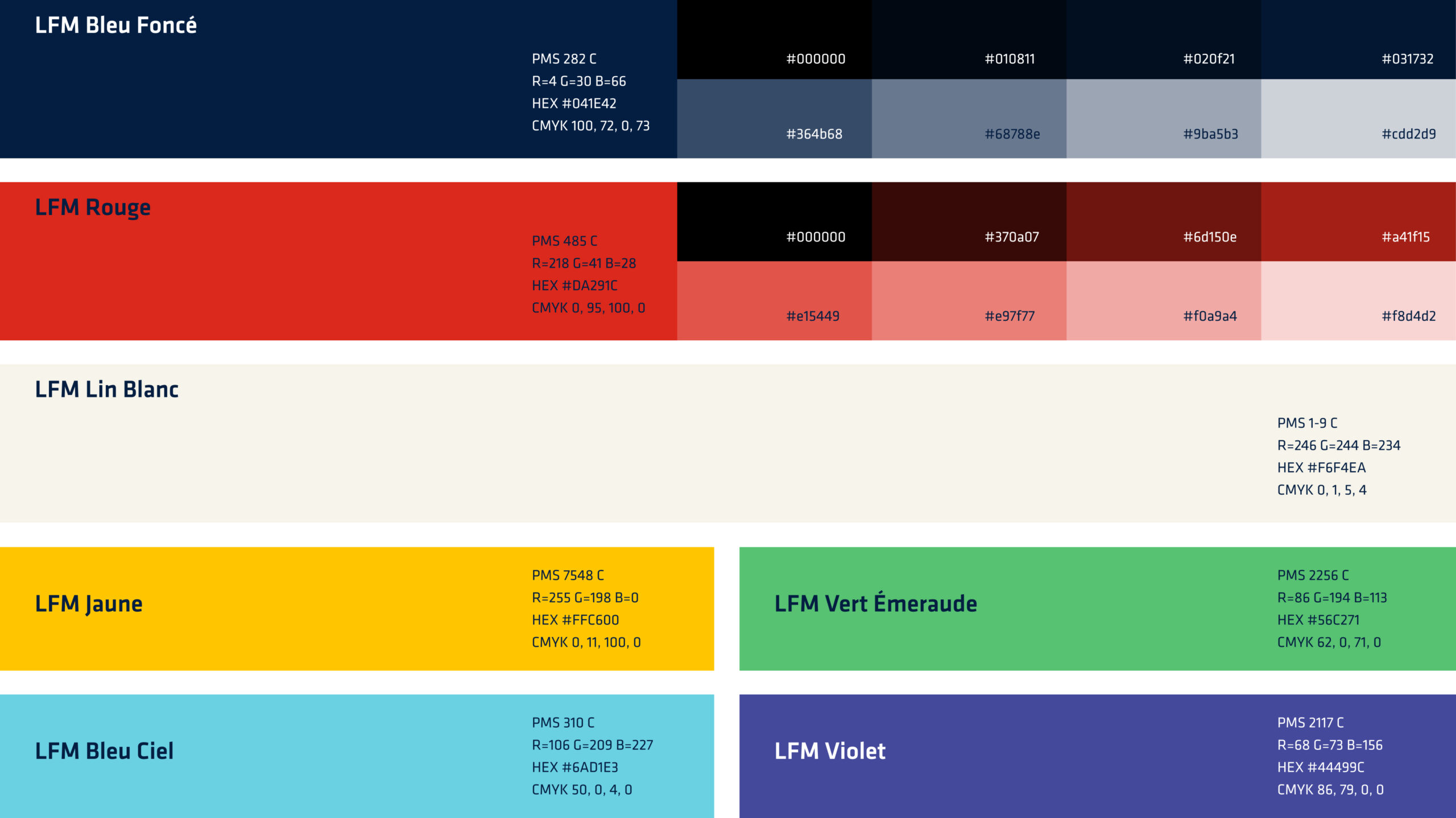 La Marinière es el elemento gráfico más singular del sistema. Inspirado en el icónico estampado marinero francés y construido sobre las líneas estructurales del propio símbolo del LFM.